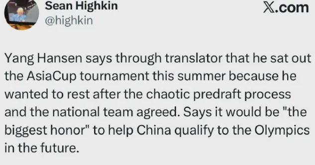此前杨瀚森在开拓者新赛季媒体日接受采访时,表示:“未来若能帮助中国男篮重返奥运会,将会是他的最大荣誉。”